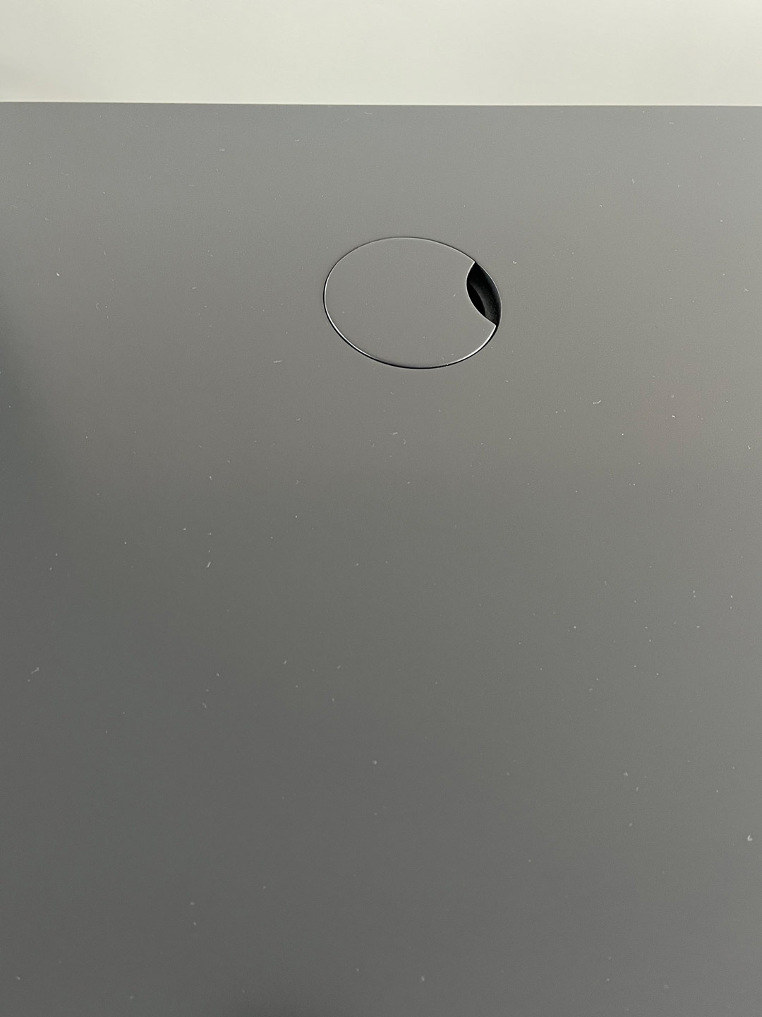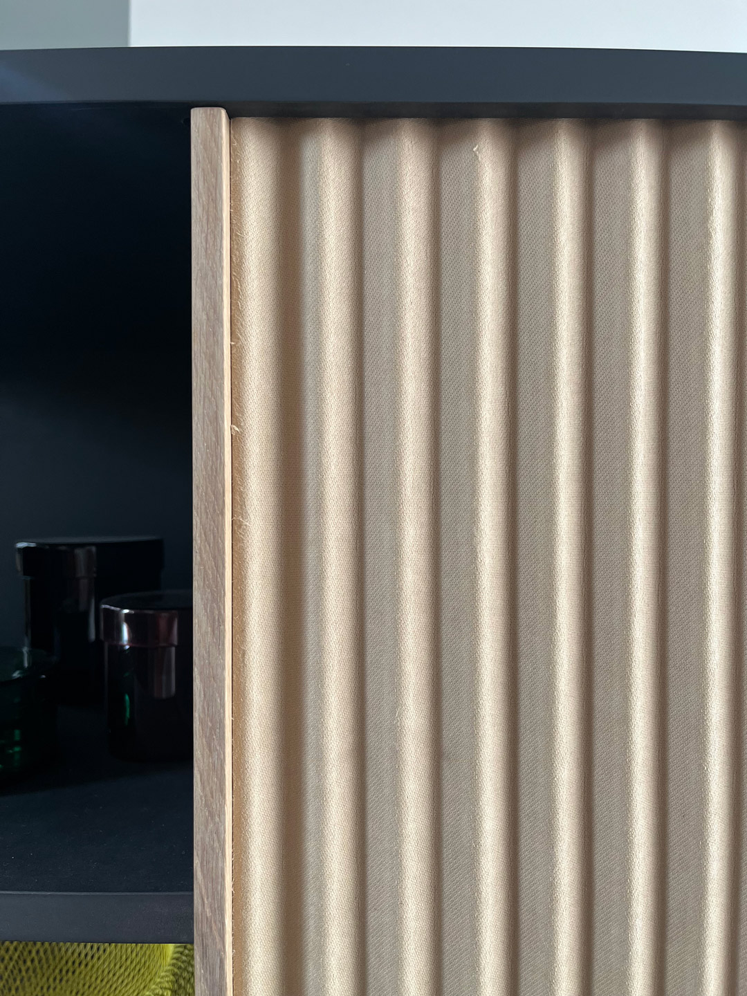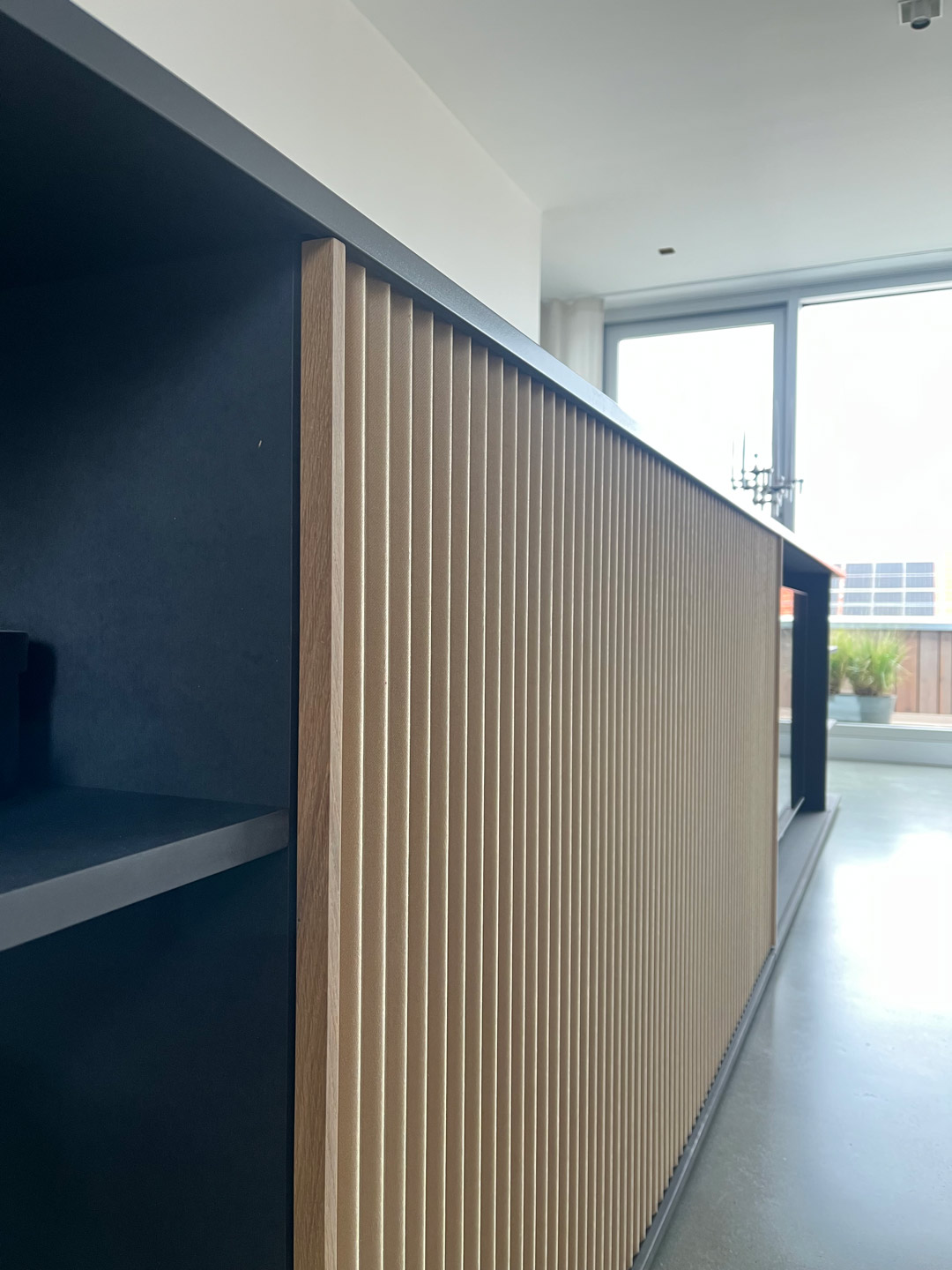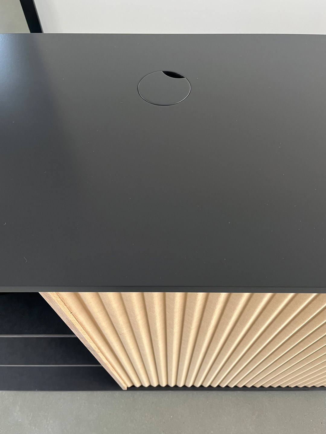 Sideboard gefertigt aus MDF schwarz eingefärbt Die Innenseiten stumpfmatt lackiert. Die Außenseiten anthrazit seidenmatt lackiert Front aus Wellpappe mit seitlichen Griffleisten aus Eiche