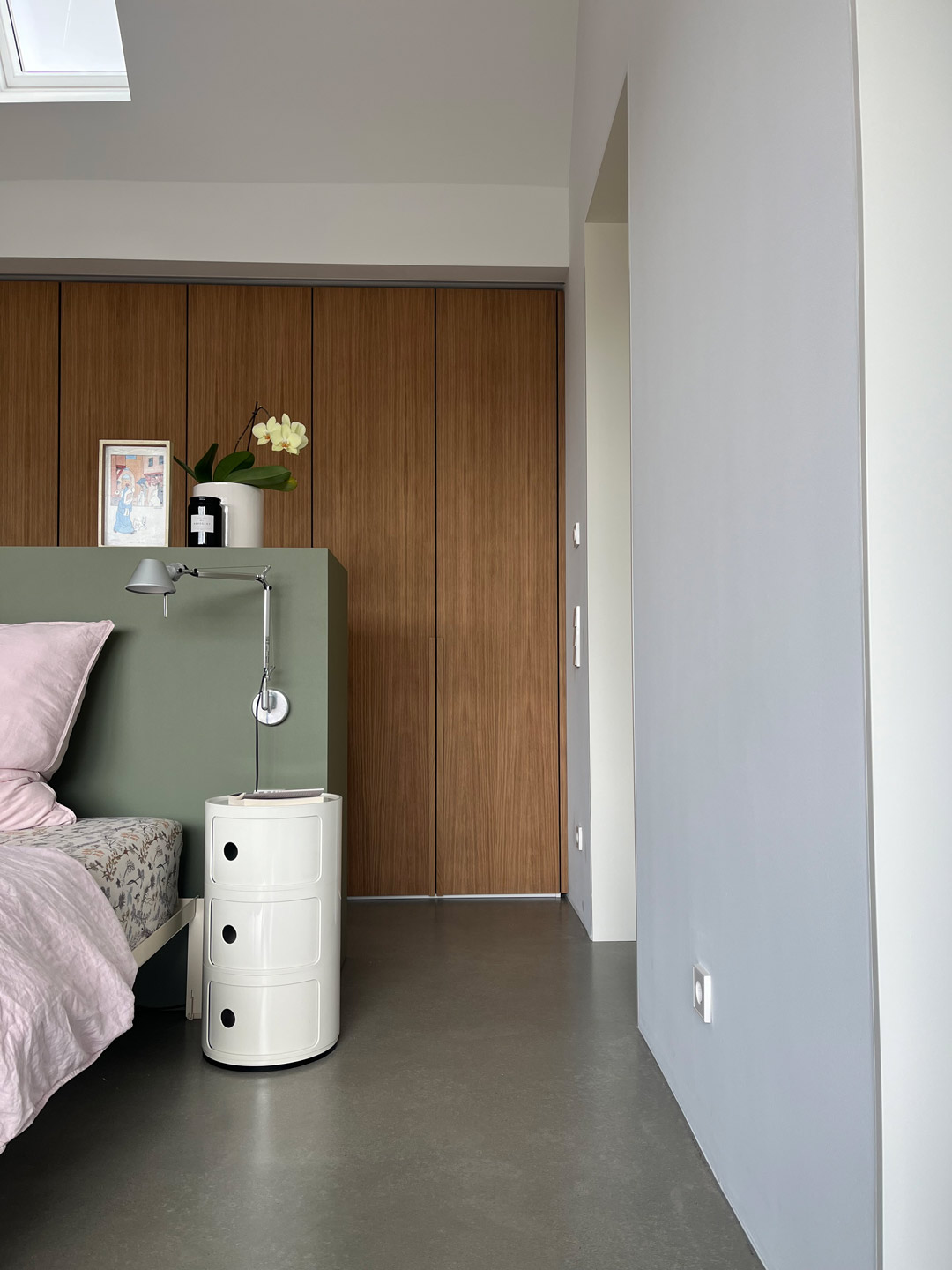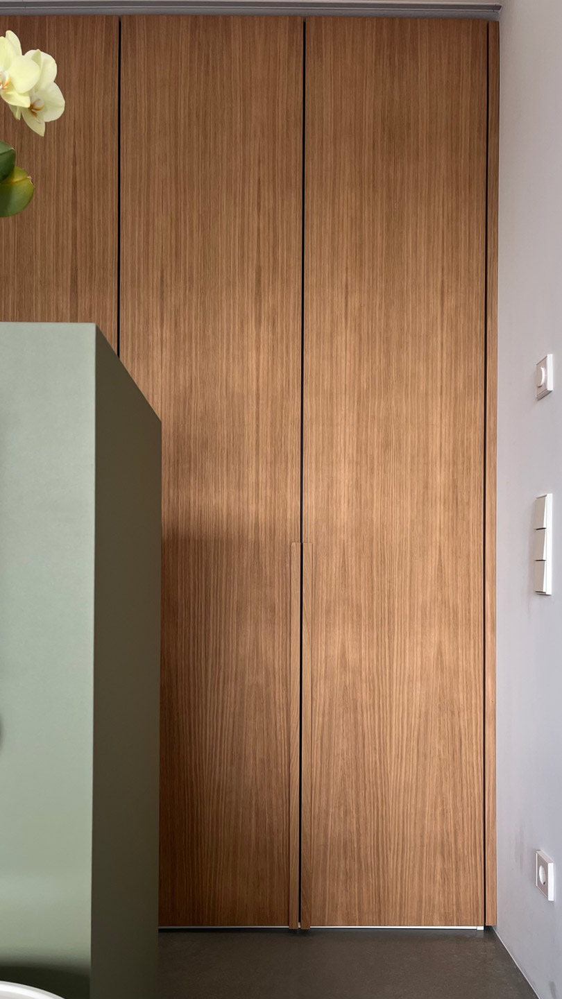 Kopfteil mit Linoleum beschichtet und auf gehrung verleimt. Kleiderschrank unter Dachschräge mit furnierten Eichentüren Oberfläche: Stumpfmatt lackiert