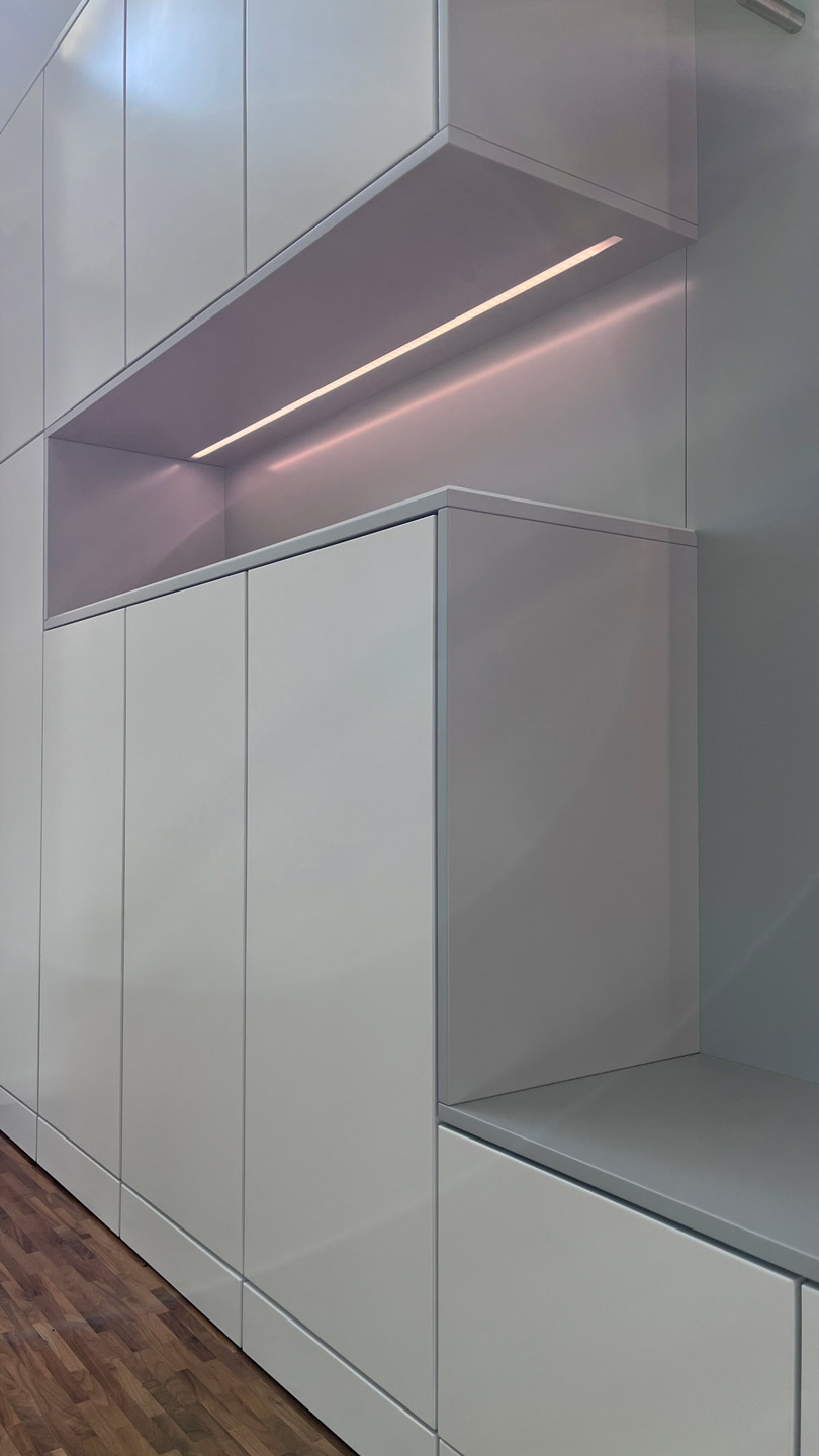 Schrankwand im Flurbereich mit einer Nische zum sitzen und einem Spiegel im Rücken und im Übergang zu einer Nische zur Ablage von Utensilien mit einer satinieren Glasplatte als Abdeckplatte. In beide Nischen ist jeweils eine LED - Leuchtleiste flächenbündig eingelassen. Die Fronten sind Verkehrsweiß seidenmatt lackiert. Die Nischen in Lichtgrau seidenmatt lackiert.