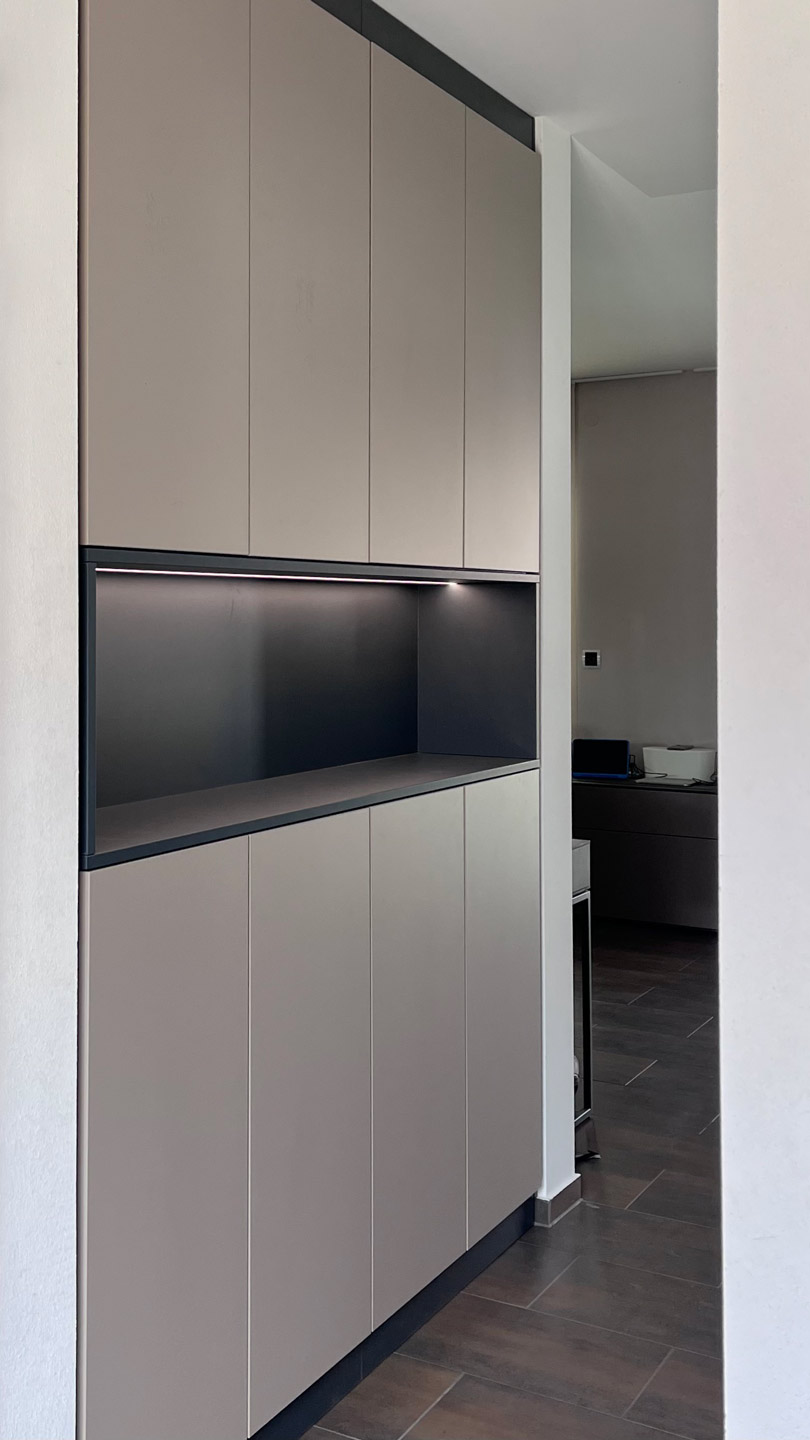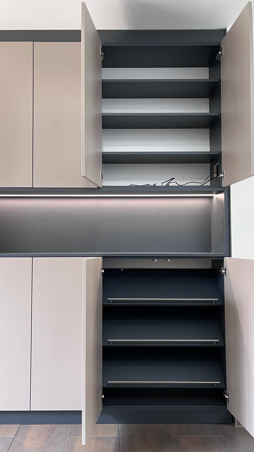 Schuhschrank im Flurbereich. Nische mit einer flächenbündig eingelassenen LED - Leuchtleiste Im unteren Bereich: Ablage für Schuhe Im oben: Stauraum mit Einlegeböden