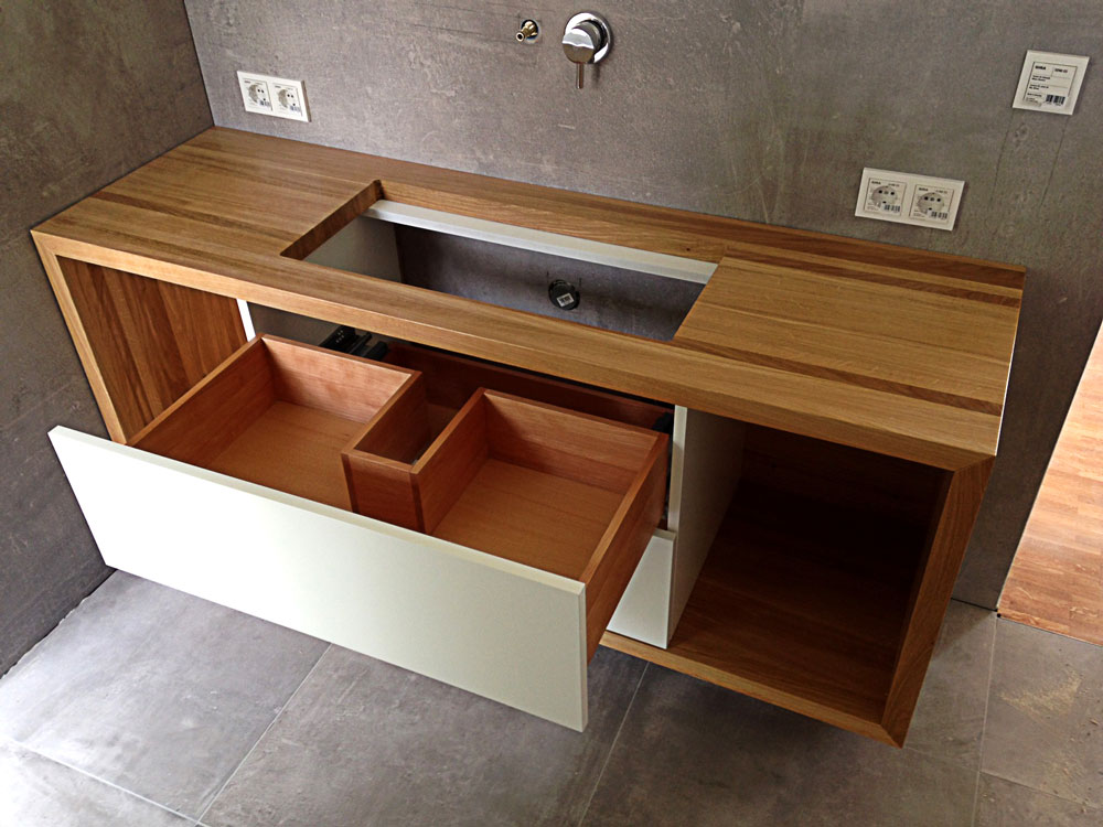Waschtischkonsole mit zwei Schubkäsen und beidseitigen Nischen. Der rechteckig gestaltete, aus Eiche gefertigte Korpus verleiht den beiden Schubkästen einen Rahmen, wodurch die Waschtischkonsole in sich geschlossen wirkt und einen kubistischen Charakter bekommt.