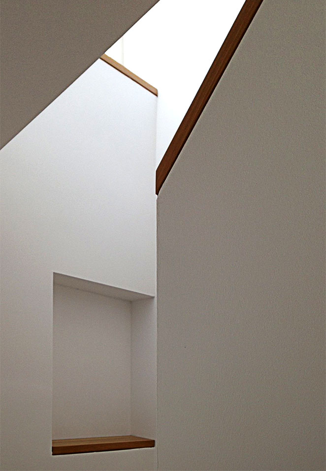 Eine Handlaufauflage für ein umgestaltetes Treppenhaus eines Einfamilienhauses, mit Fensterbänken, die eine Verbundenheit zum Handlauf herstellen. Holzart Eiche Vollholz.