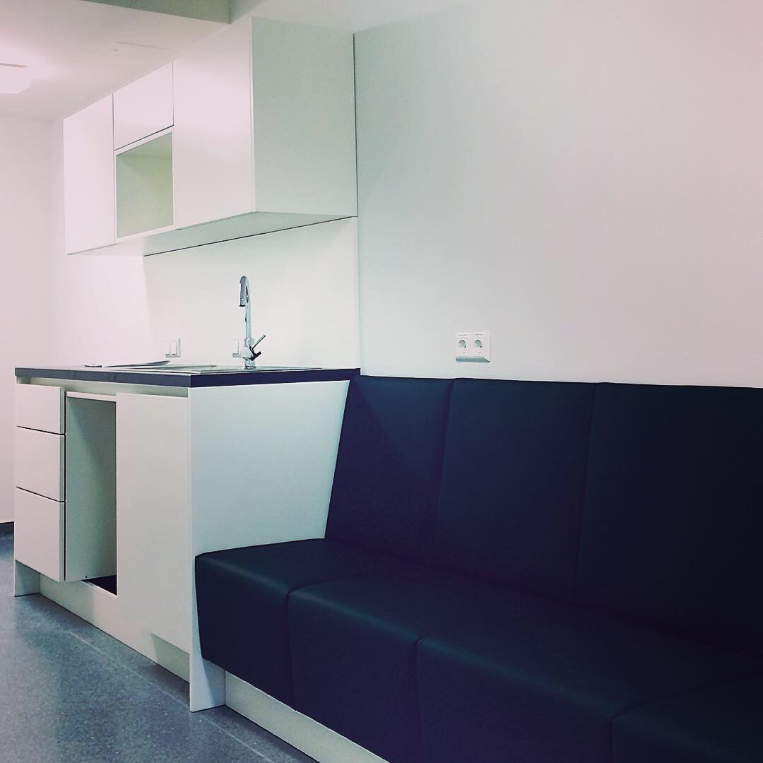 Ein Postfachschrank mit ganz vielen Türen. Eine Sitzbank die zum Verweilen einlädt und eine Pantrykitchen. Diese Komponenten machen einen Raum zu Aufenthaltsraum.