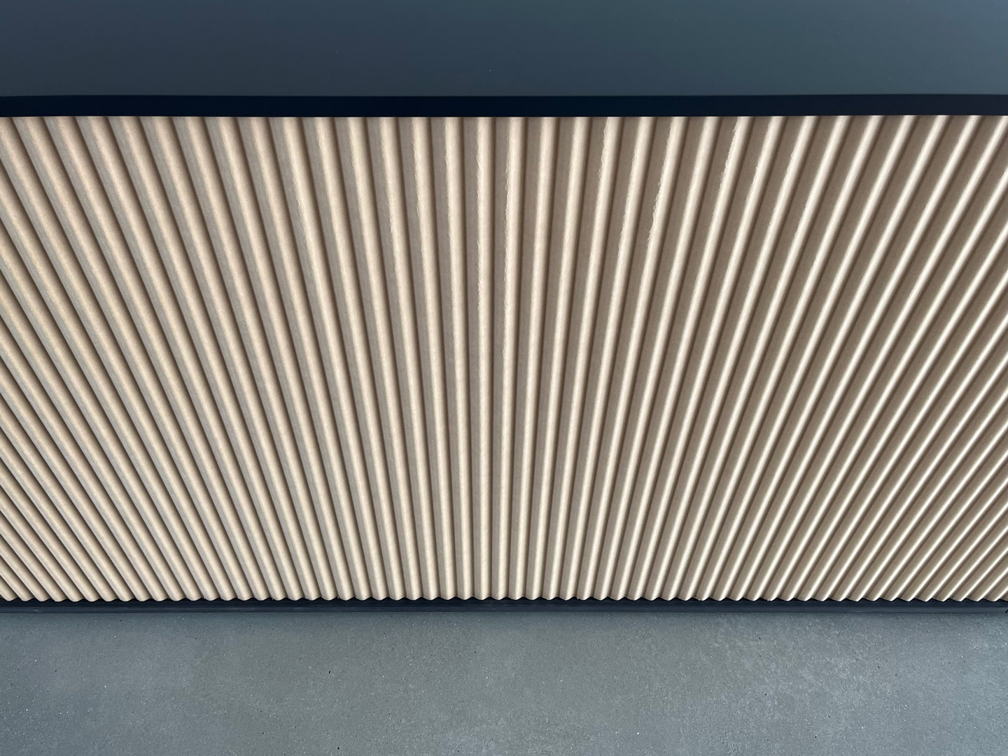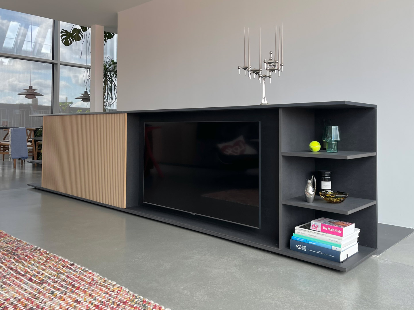Sideboard gefertigt aus MDF schwarz eingefärbt Die Innenseiten stumpfmatt lackiert. Die Außenseiten anthrazit seidenmatt lackiert Front aus Wellpappe mit seitlichen Griffleisten aus Eiche