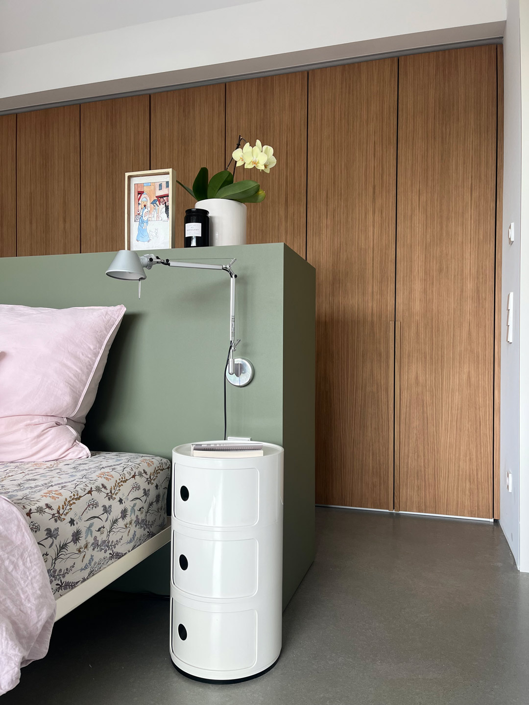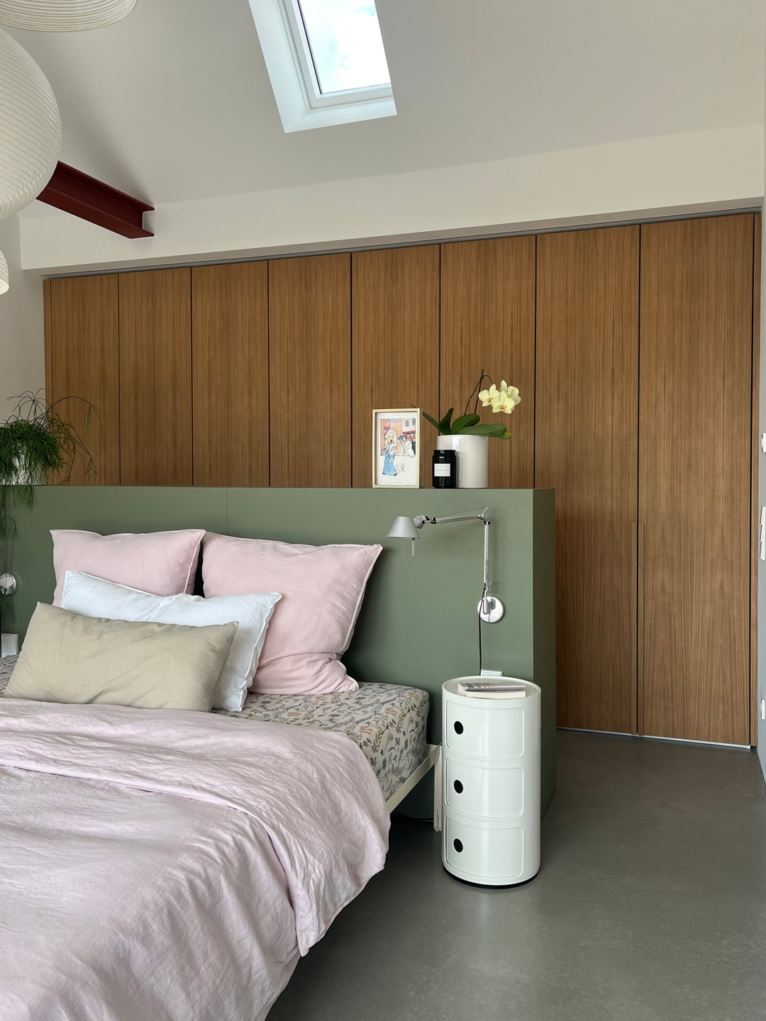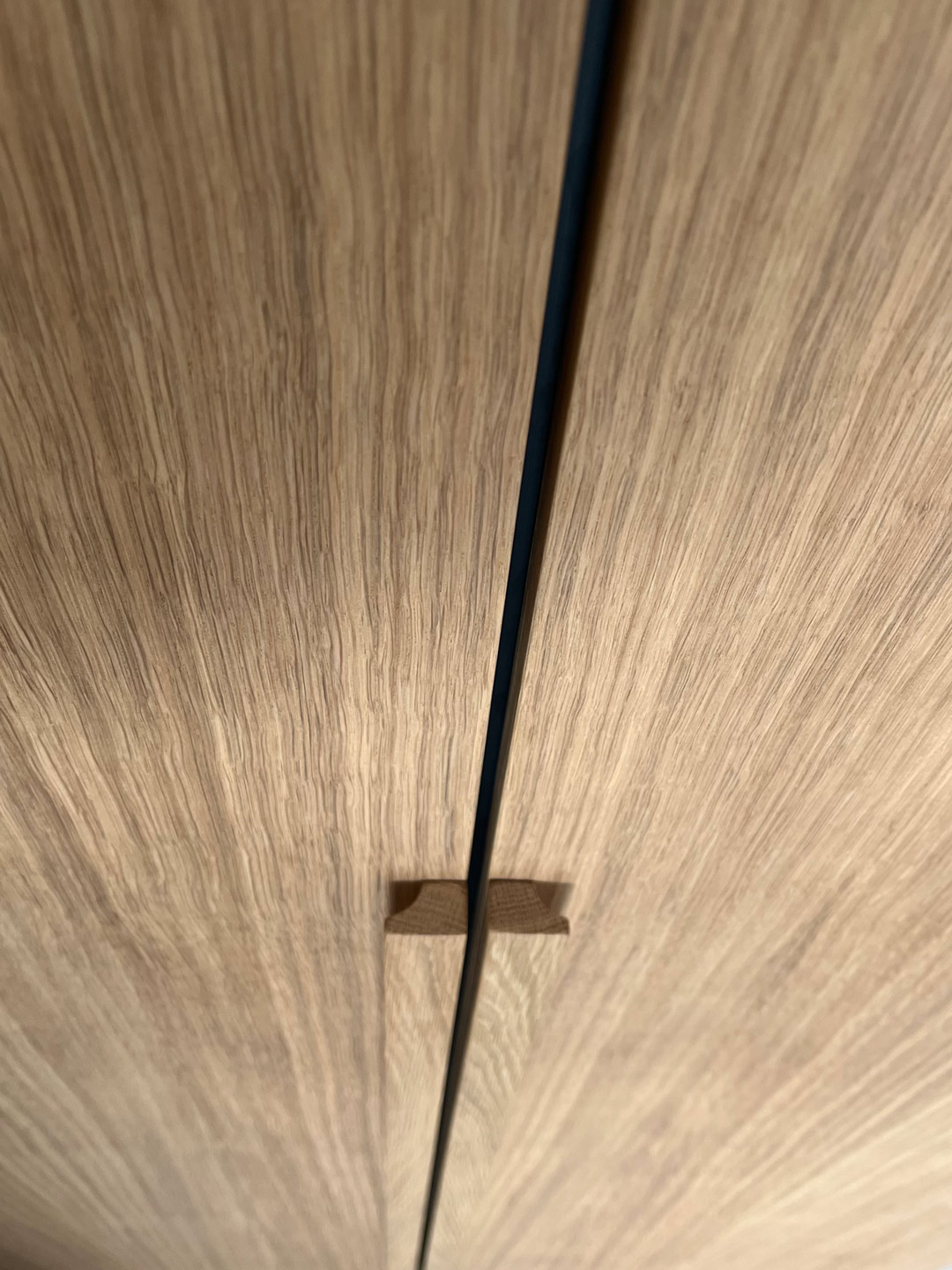 Kopfteil mit Linoleum beschichtet und auf gehrung verleimt. Kleiderschrank unter Dachschräge mit furnierten Eichentüren Oberfläche: Stumpfmatt lackiert