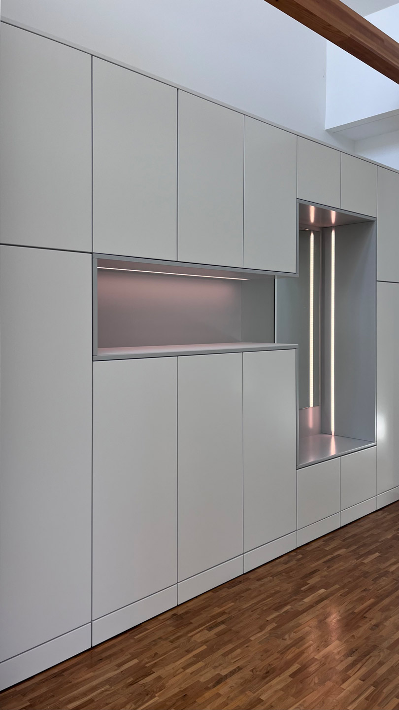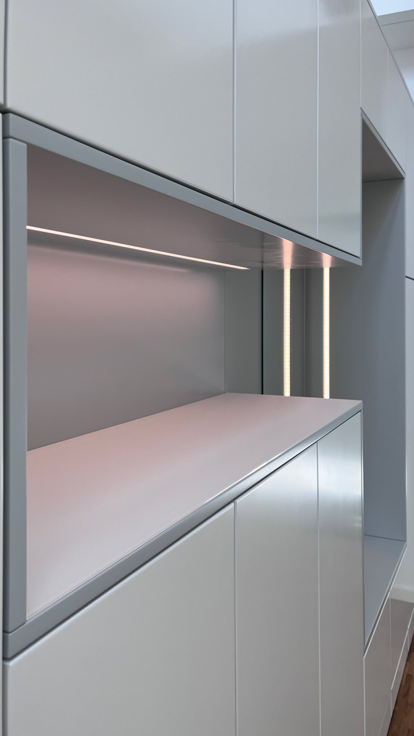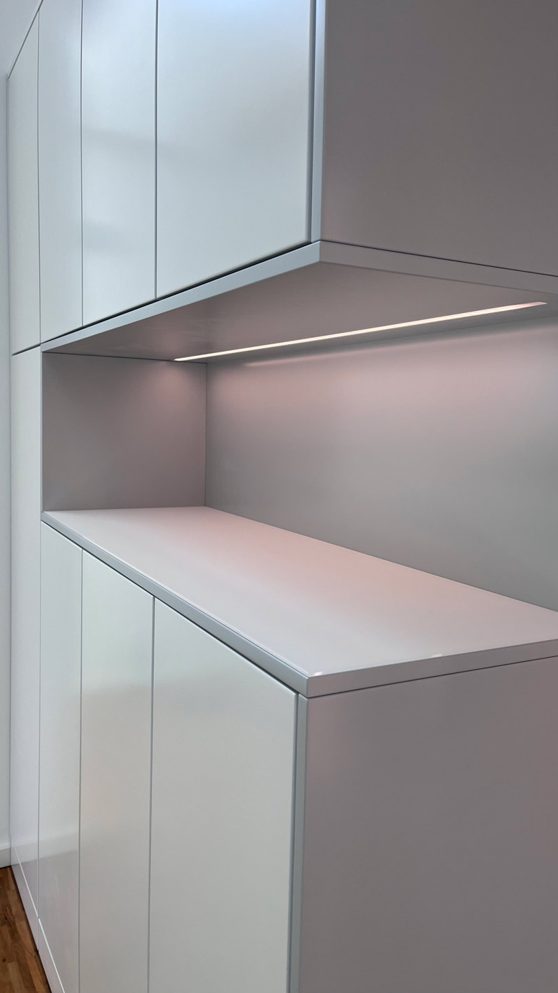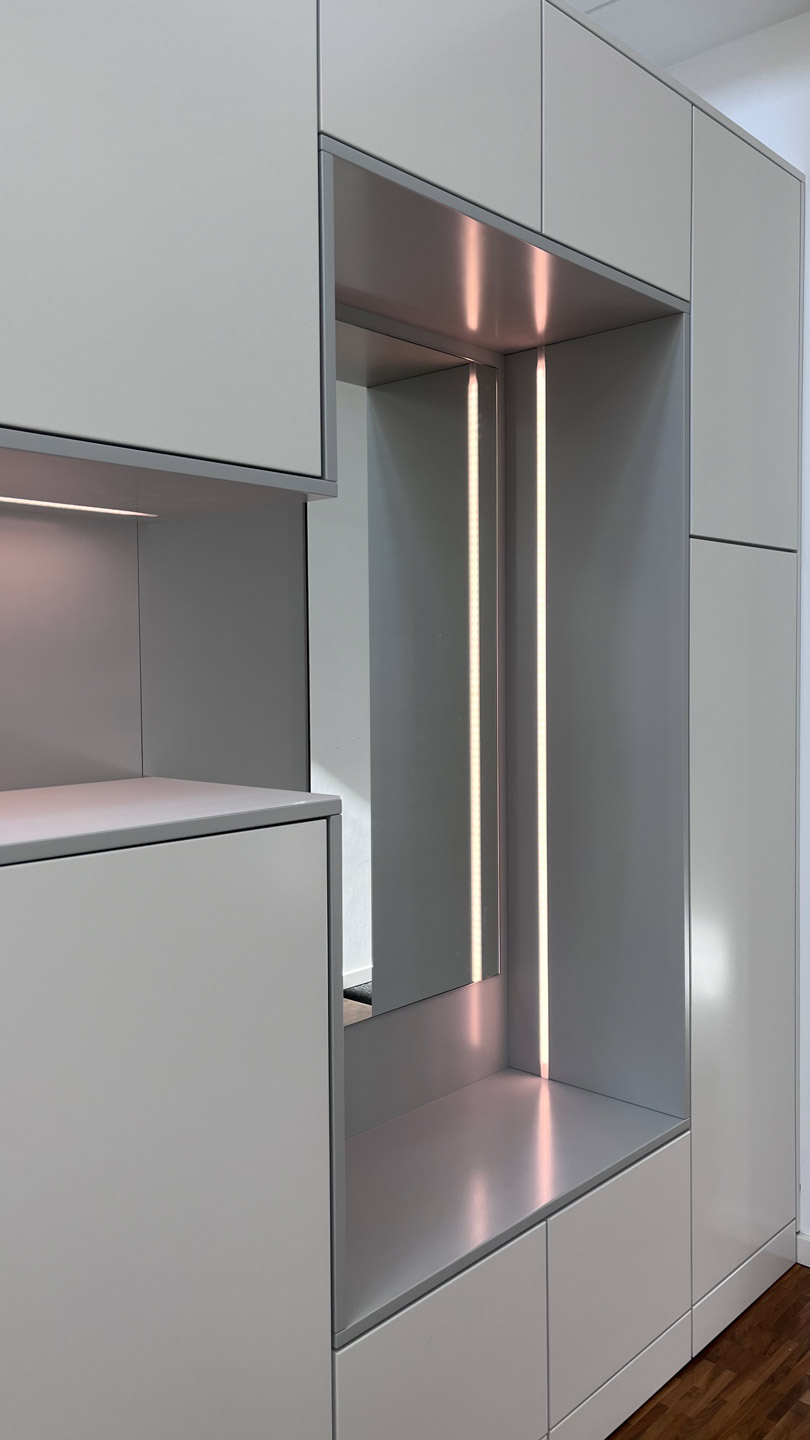 Schrankwand im Flurbereich mit einer Nische zum sitzen und einem Spiegel im Rücken und im Übergang zu einer Nische zur Ablage von Utensilien mit einer satinieren Glasplatte als Abdeckplatte. In beide Nischen ist jeweils eine LED - Leuchtleiste flächenbündig eingelassen. Die Fronten sind Verkehrsweiß seidenmatt lackiert. Die Nischen in Lichtgrau seidenmatt lackiert.