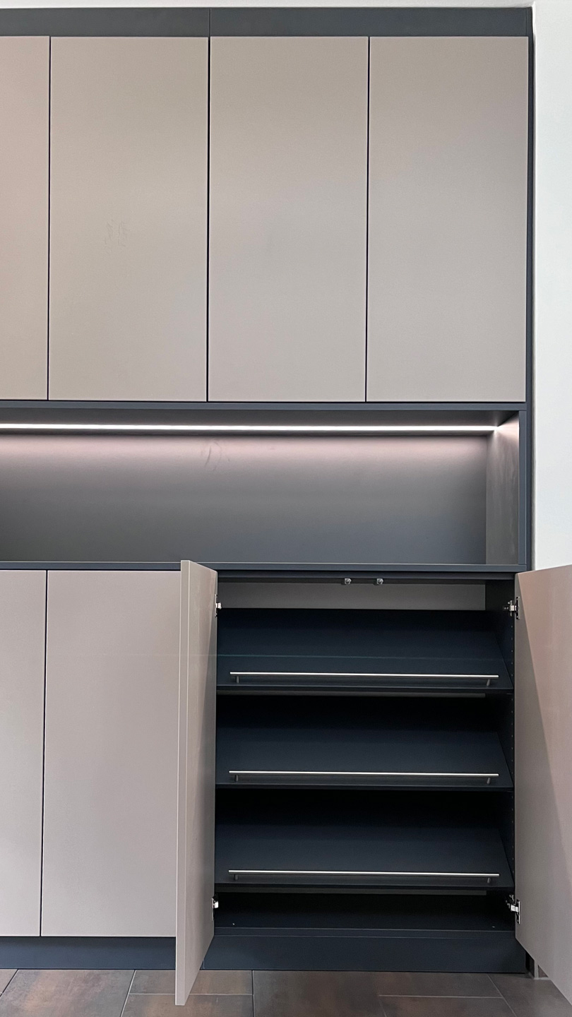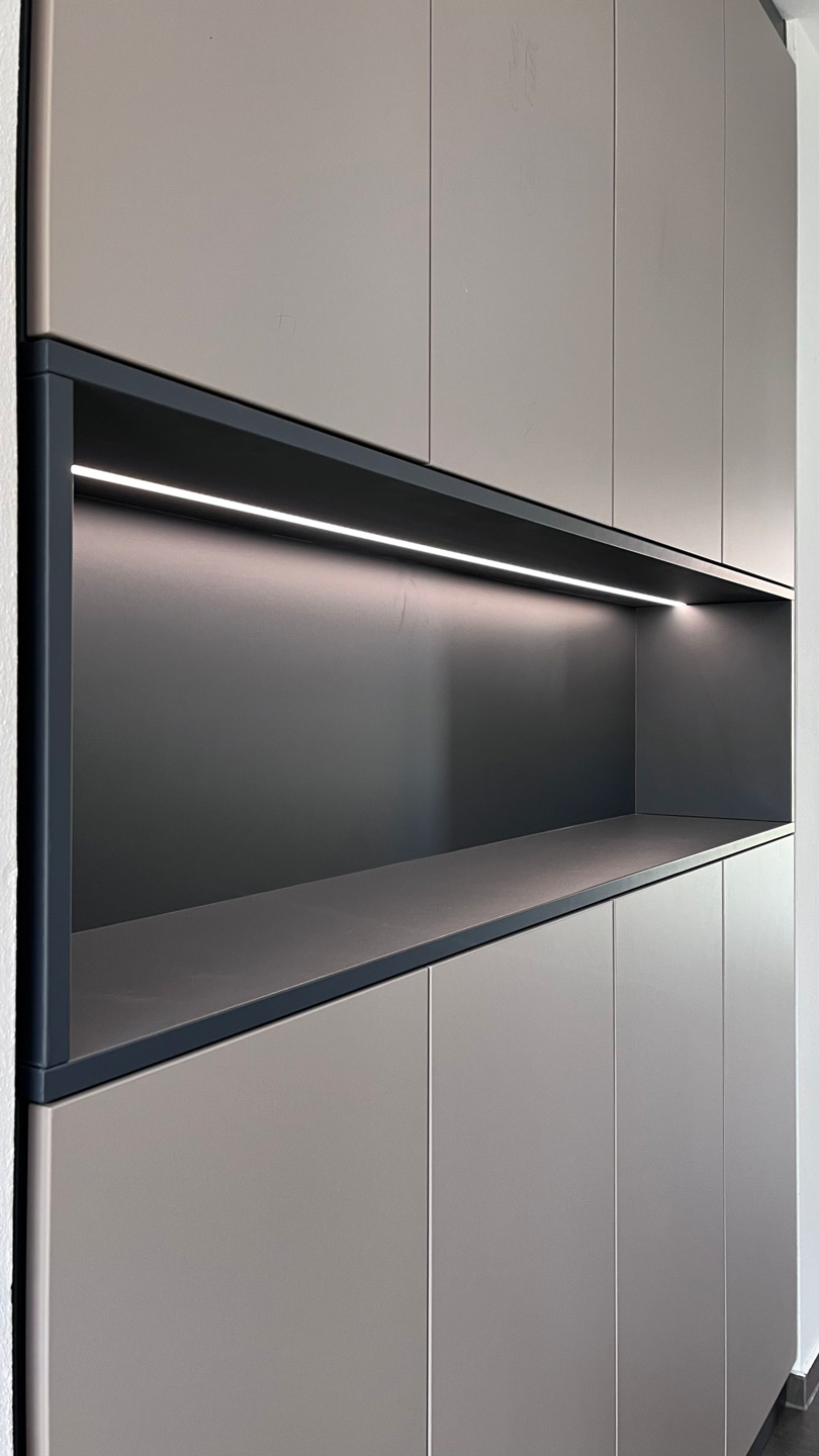 Schuhschrank im Flurbereich. Nische mit einer flächenbündig eingelassenen LED - Leuchtleiste Im unteren Bereich: Ablage für Schuhe Im oben: Stauraum mit Einlegeböden